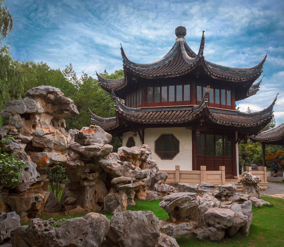 在园林和城市绿化地段内建造的供人们游憩或观赏用的仿古建筑,常见的有亭、榭、廊、阁、轩、楼、台、舫、厅堂等建筑物。