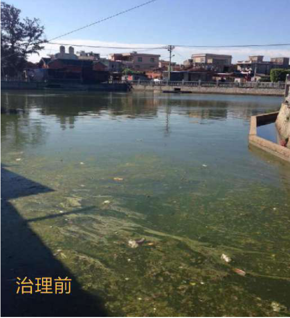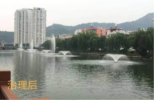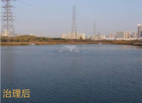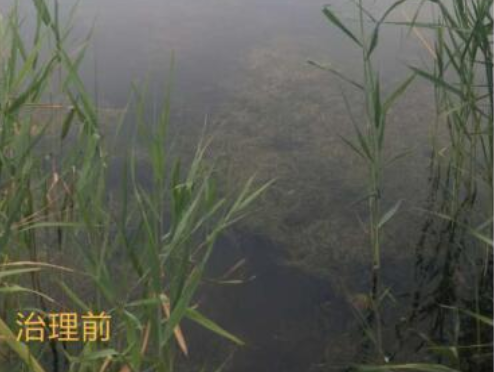 治理后,水体颗粒藻类消除,颜色浅绿,水体透明度提高,景观恢复。